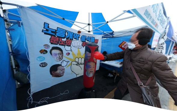 또 다른 부스(노동개혁가 윤석열에게 성난 주먹을 날리며)에서는 윤 총장과 김건희 여사가 그려진 샌드백을 주먹과 도깨비 방망이로 두드리는 퍼포먼스도 선보였다.