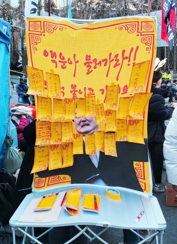“가라, 불운이여! 부적 붙이고 가라’는 원색으로 윤 총장을 비판하고 퇴진을 기원하는 작은 부적들로 가득 차 있었다. 이 부적에는 “악령 윤석열 물러가라” “비켜달라” “파시스트 검찰을 박살내라” 등 대통령과 검찰을 비판하는 문구가 가득했다.