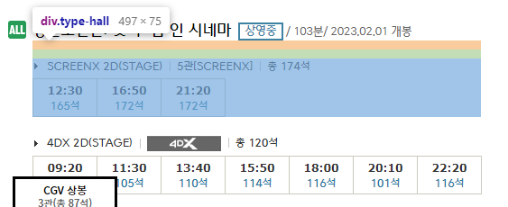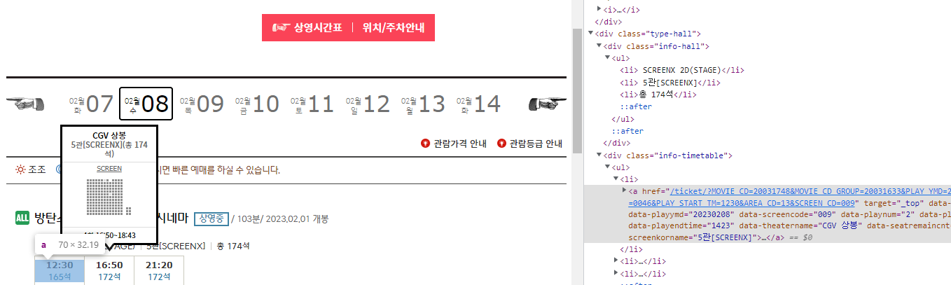 - 시간, 잔여좌석수 – 정보 시간표 > ul > li > a에 data-playstarttime, data-seatremaincnt로 저장됩니다.