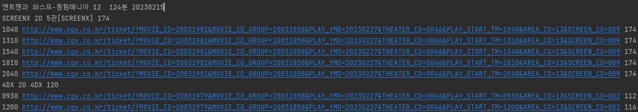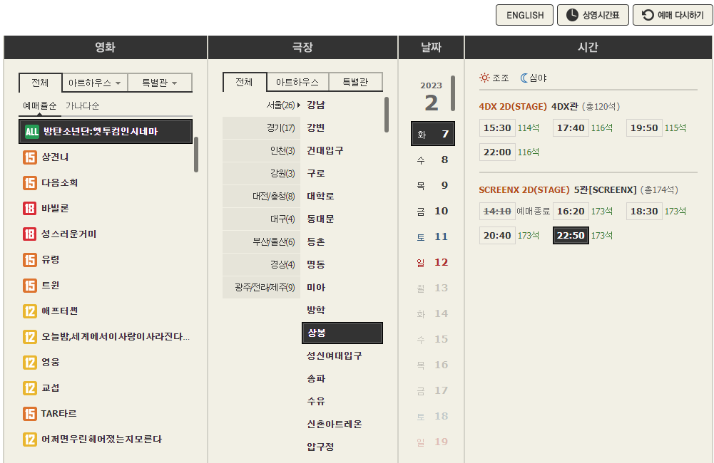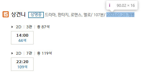 이제 각 영화에 대한 극장 및 상영 정보를 알아봅시다.
