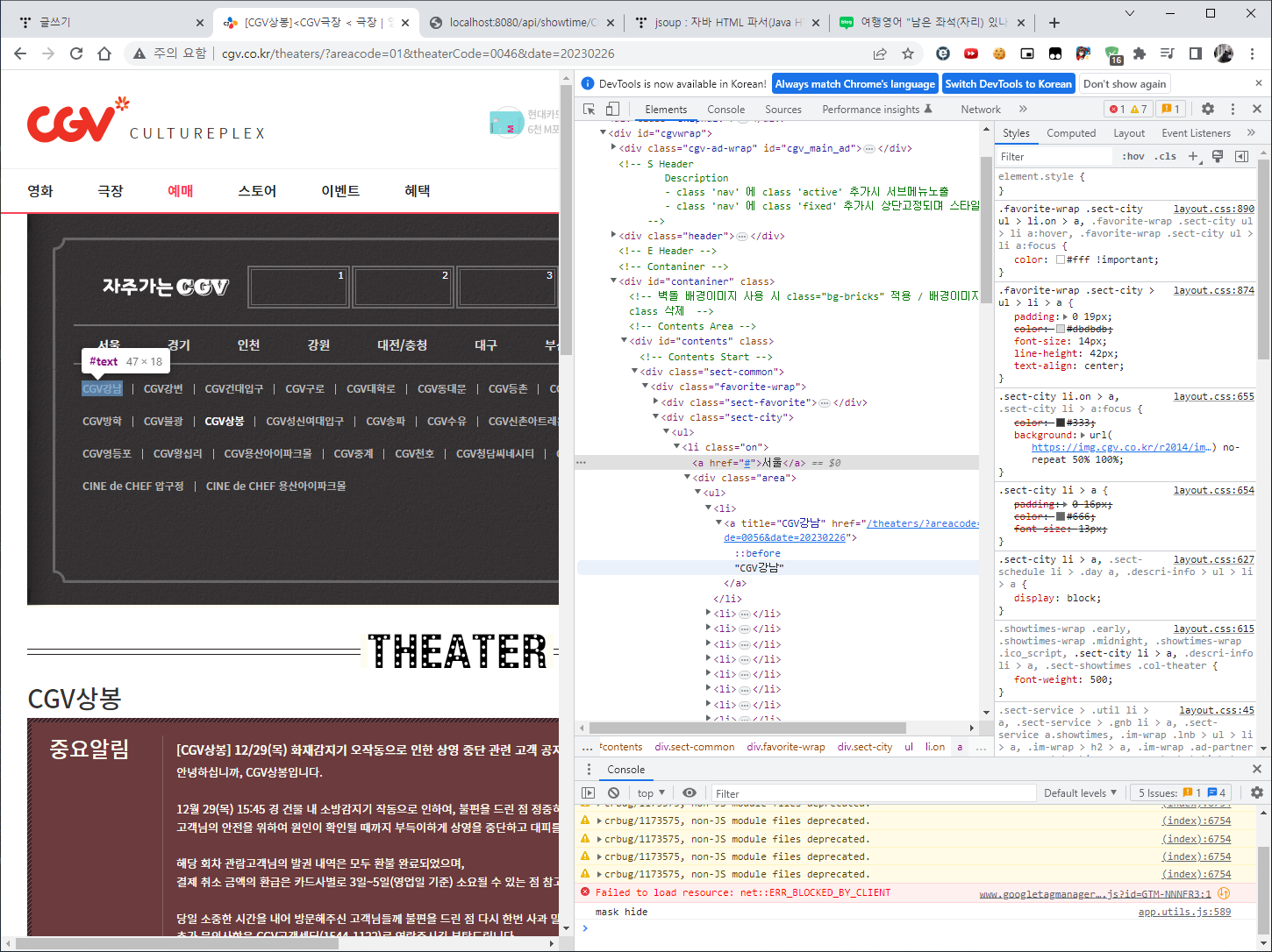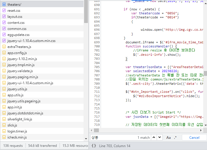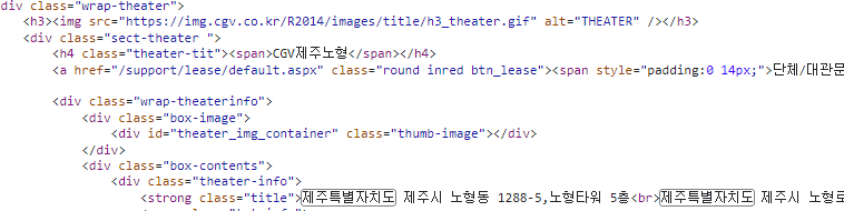 소스코드 대신 극장 정보를 보내는 API가 있다면 F12 키를 눌러 사용하시고 NETWORK 탭으로 가셔서 검색하시면 됩니다.
