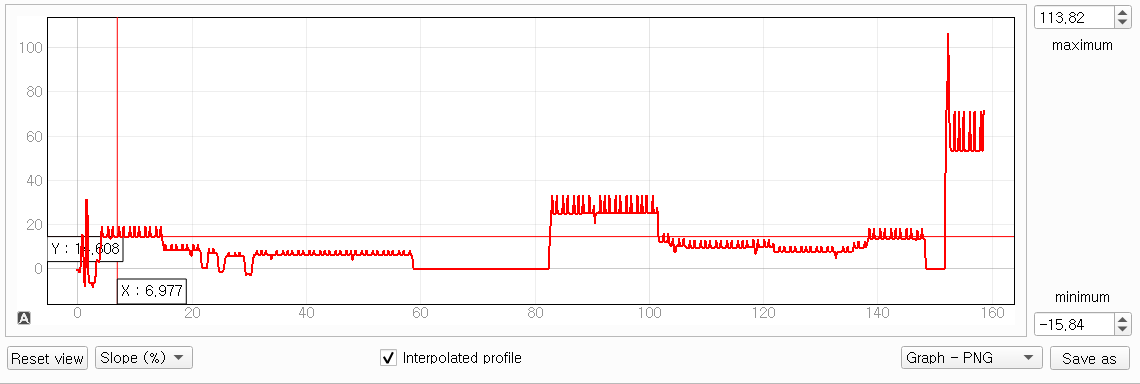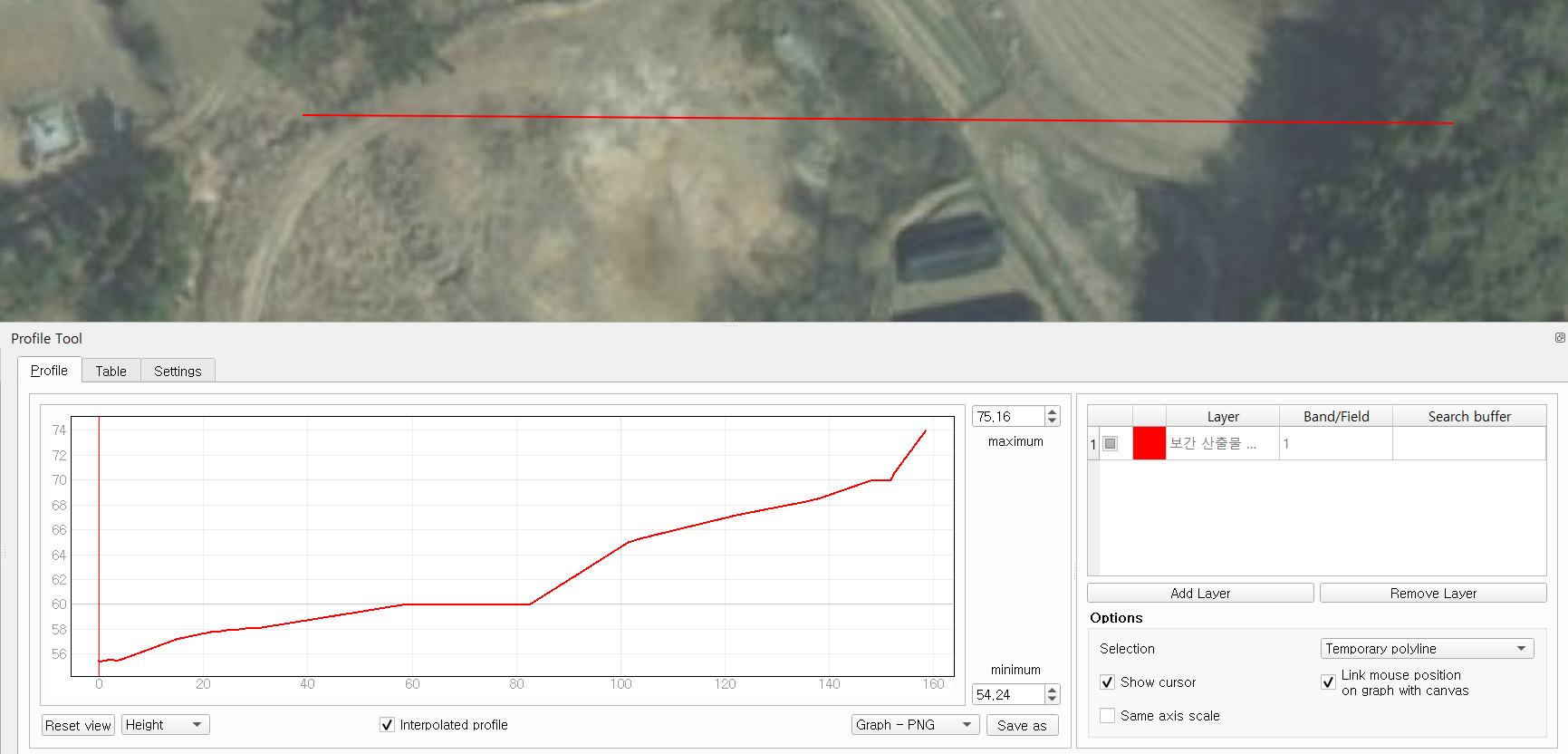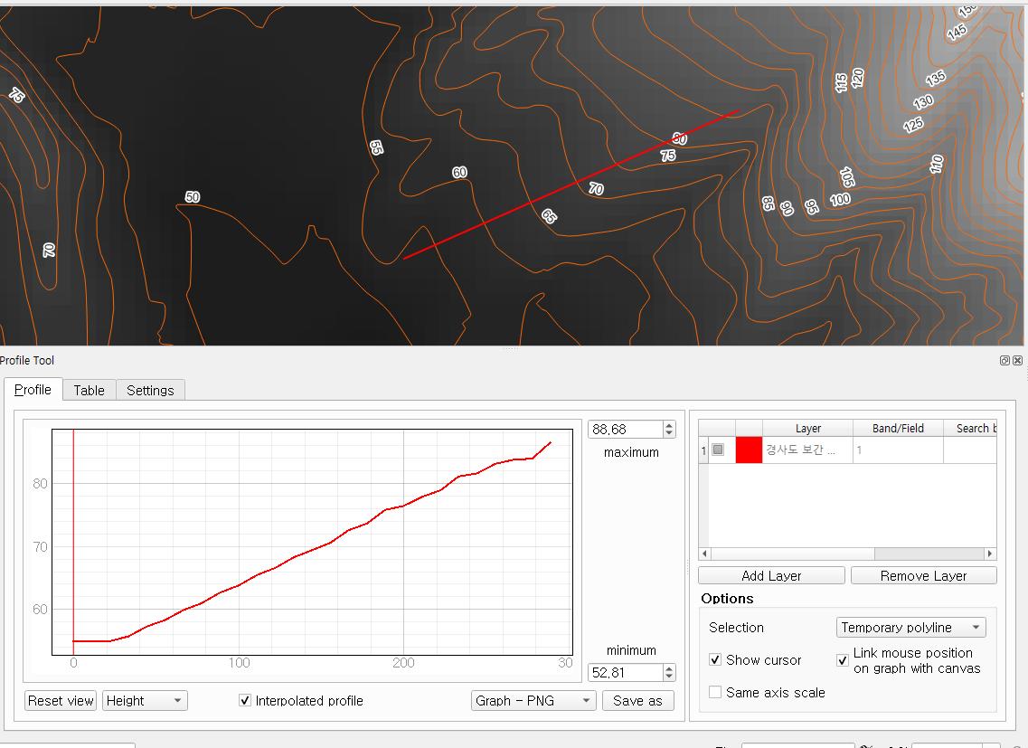 프로파일 도구를 사용하면 아래와 같이 DEM 레이어를 사용하여 직선으로 그린 영역의 높이를 표로 확인할 수 있습니다.
